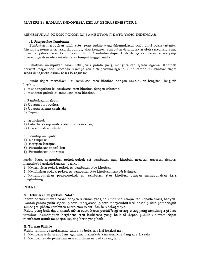 DOC) MATERI 1 : BAHASA INDONESIA KELAS XI IPA SEMESTER 1 MENEMUKAN POKOK-POKOK ISI SAMBUTAN/ PIDATO YANG DIDENGAR | Arini Komalasari - Academia.edu