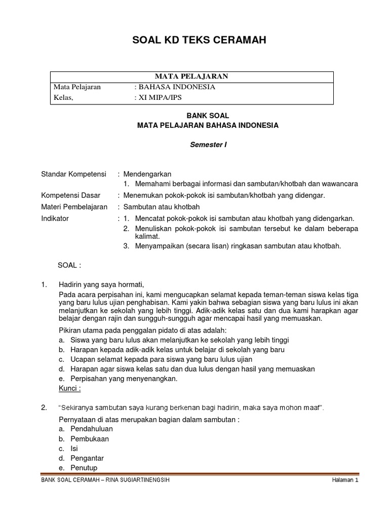 Soal Kd Teks Ceramah: Mata Pelajaran Kelas,: Bahasa Indonesia: Xi Mipa/Ips