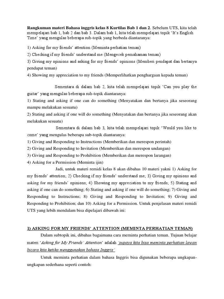 Rangkuman Materi Bahasa Inggris Kelas 8 Kurtilas Bab 1 Dan 2