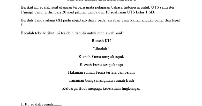 Contoh Soal UTS Semester 1 Bahasa Indonesia SD MI Kelas 1 Format Microsoft Word