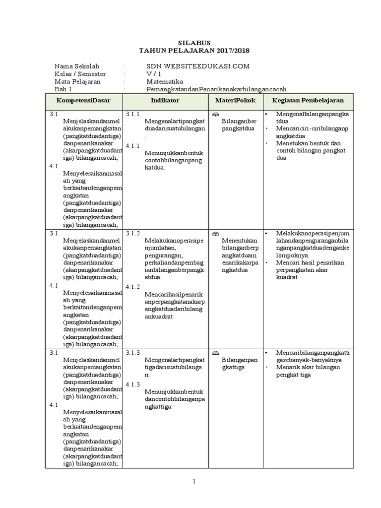 Silabus Matematika Kelas 5 Sem 1 K13 Revisi 2017