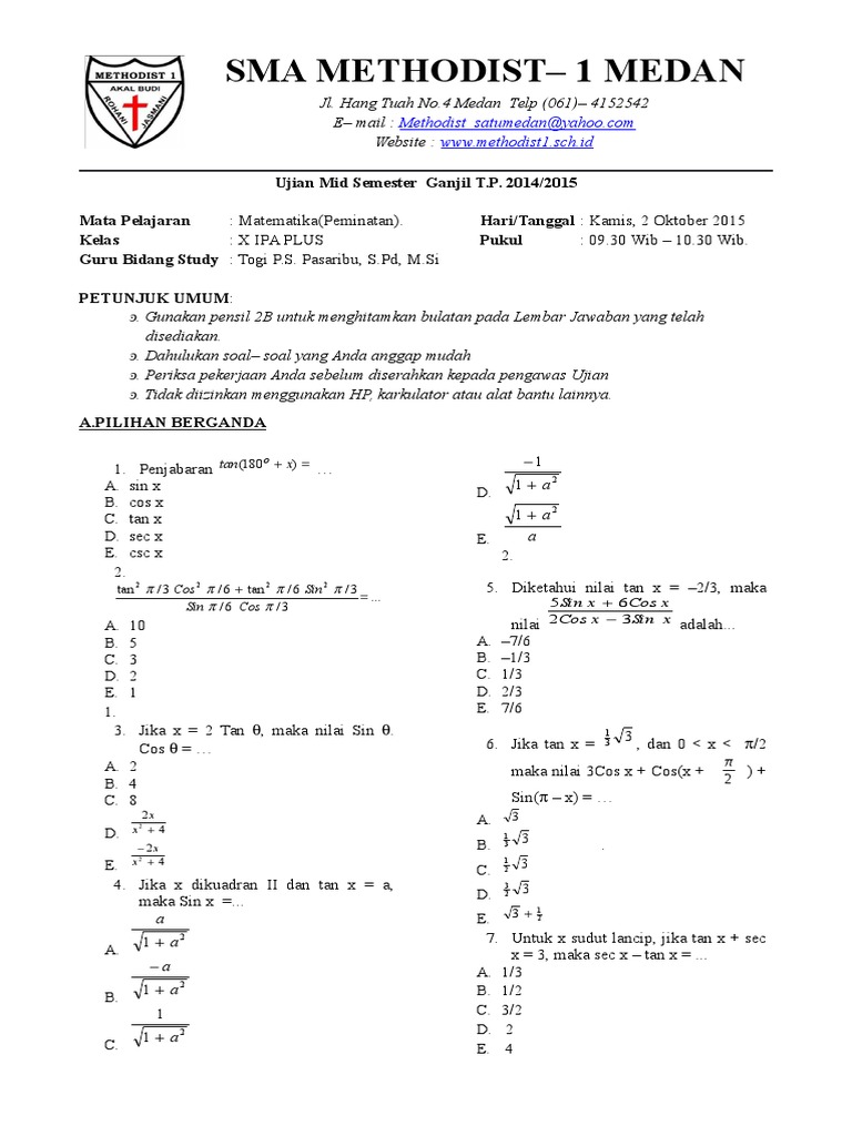 Soal PAS Matematika Peminatan Kelas 10 Semester 1 Kurikulum 2013 + …