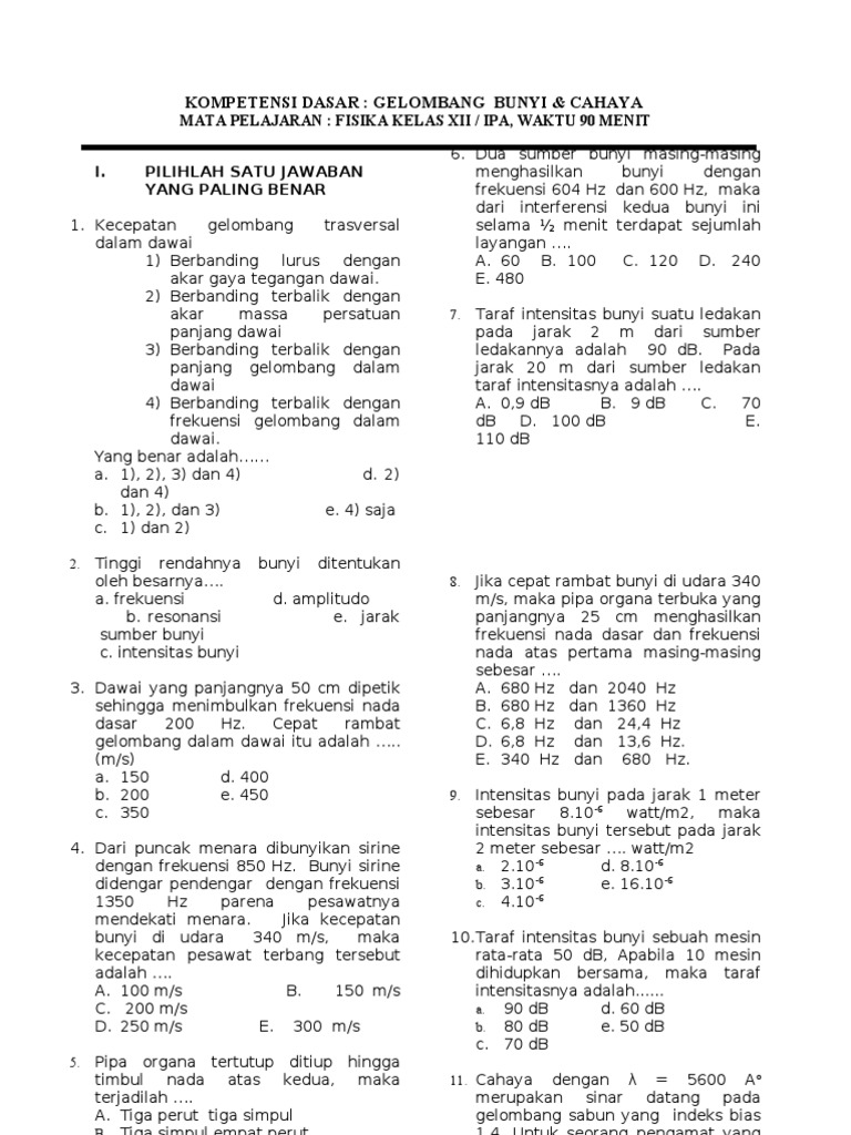 Soal Geombang Cahaya Dan Gelombang Bunyi