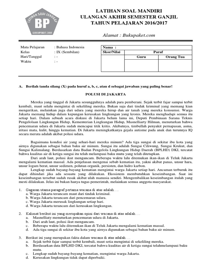 Soal Bahasa Indonesia Kelas 9 Semester 1 Dan Kunci Jawaban - Guru Galeri