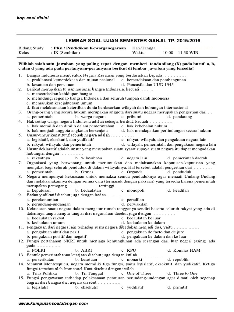 soal uas pkn kelas 9 semester 1 & 2 dan kunci jawaban kurikulum 2013/KTSP Tahun 2018/2019 - Info Pendidikan Terbaru